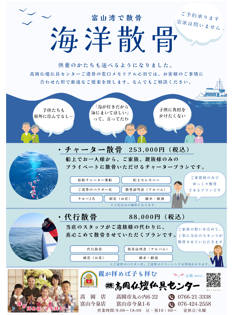 海洋散骨、樹木葬、納骨堂、手元供養などご相談承ります。 |
